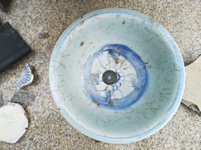 宝应博物馆工作人员闻讯后,立即赶到现场,看见古墓葬保存较为完好,除了两具棺材,在墓坑区域内,还发现了一些器物,例如一只青花瓷碗内放置了一枚宋代“太平通宝”古钱,一对水波鱼纹方形石砚。文物专家初步鉴定,青花瓷碗和水波鱼纹方形石砚都是明代的器物。