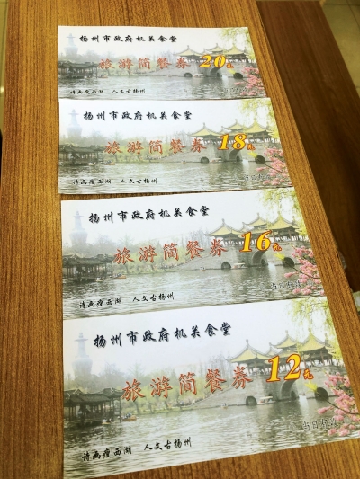在餐厅服务台,工作人员向记者展示了此次推出的4张“扬州市政府机关食堂旅游简餐券”,面额分别是12元、16元、18元和20元。服务台后方的墙面上,详细列出了对应的菜谱。